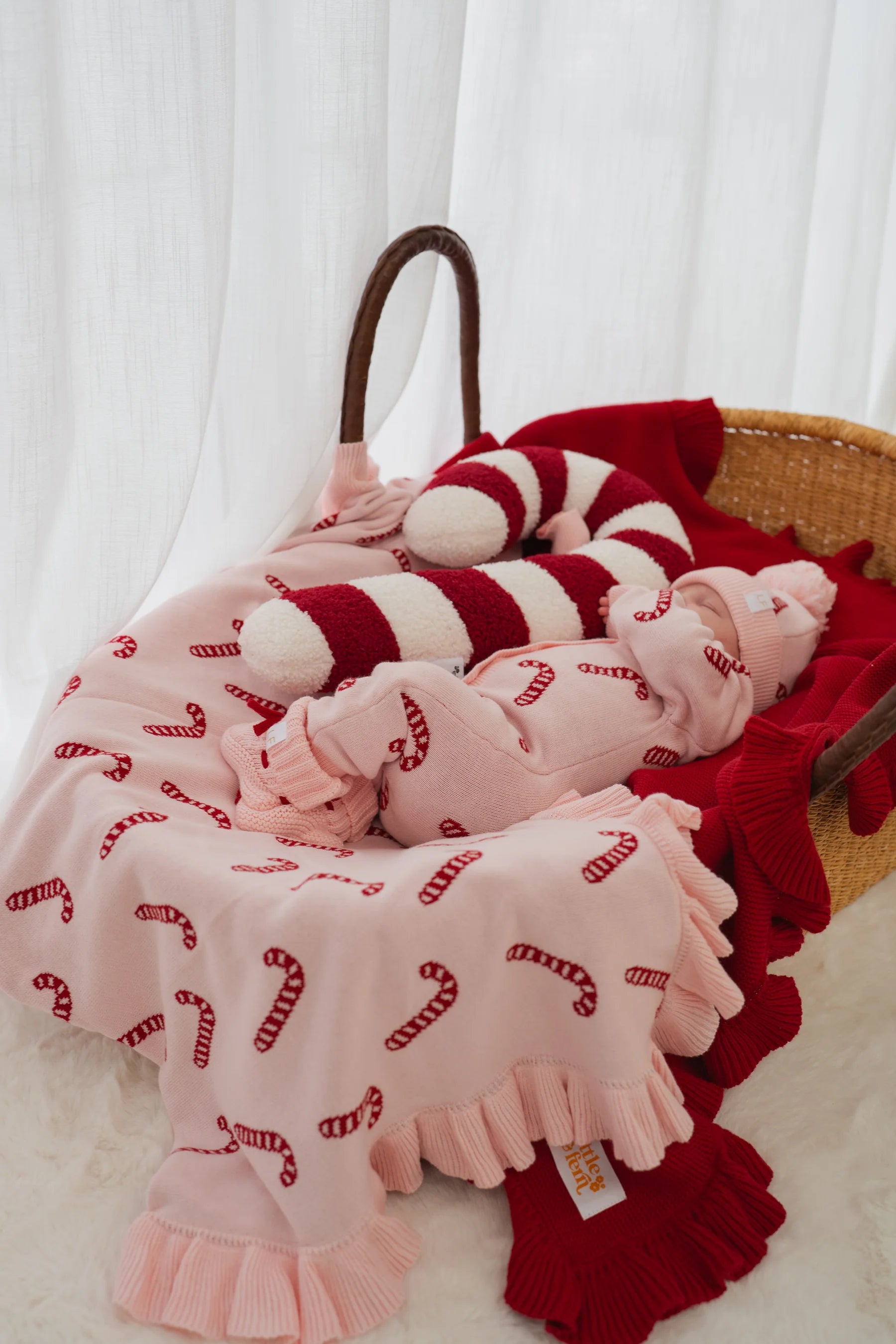 Wrap your little love in with our Frill Knit Blanket in Pink Candy Cane. Featuring a soft pink base with red candy cane detailing, this 100% cotton knit is a holiday favourite and a timeless keepsake.