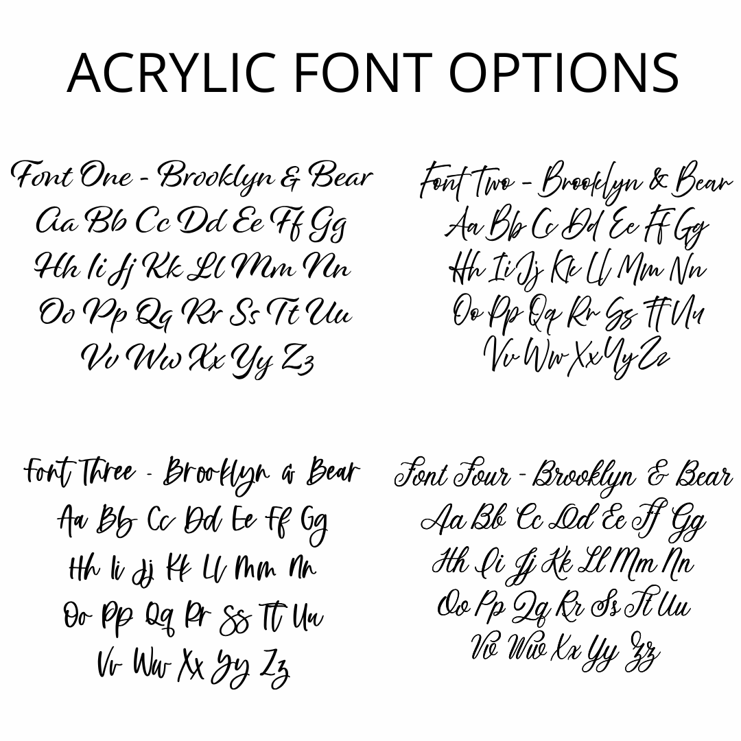 Please select your font option for the first name (in white acrylic). Please note, on all font options, the dot on a lower case i will be attached to prevent it falling off.