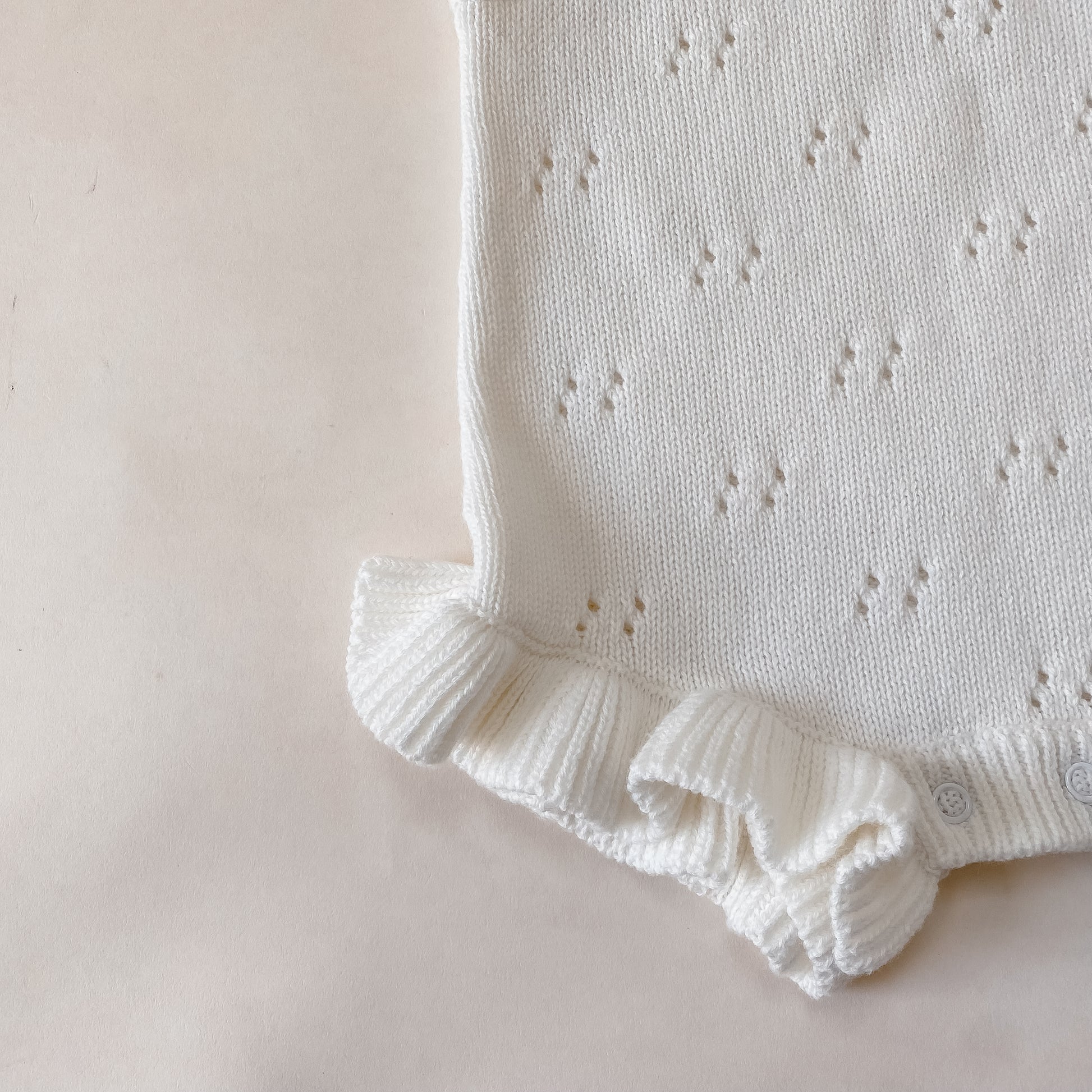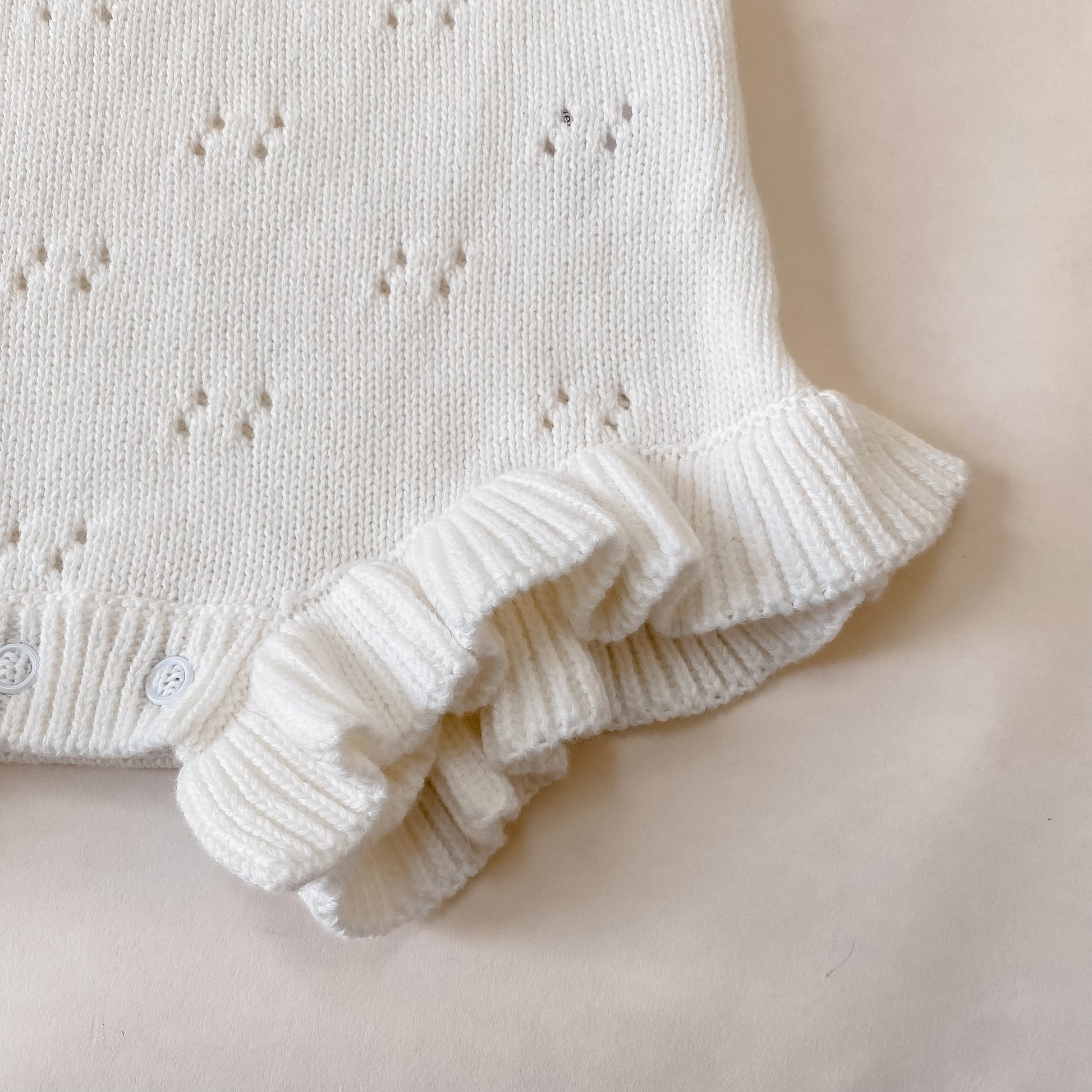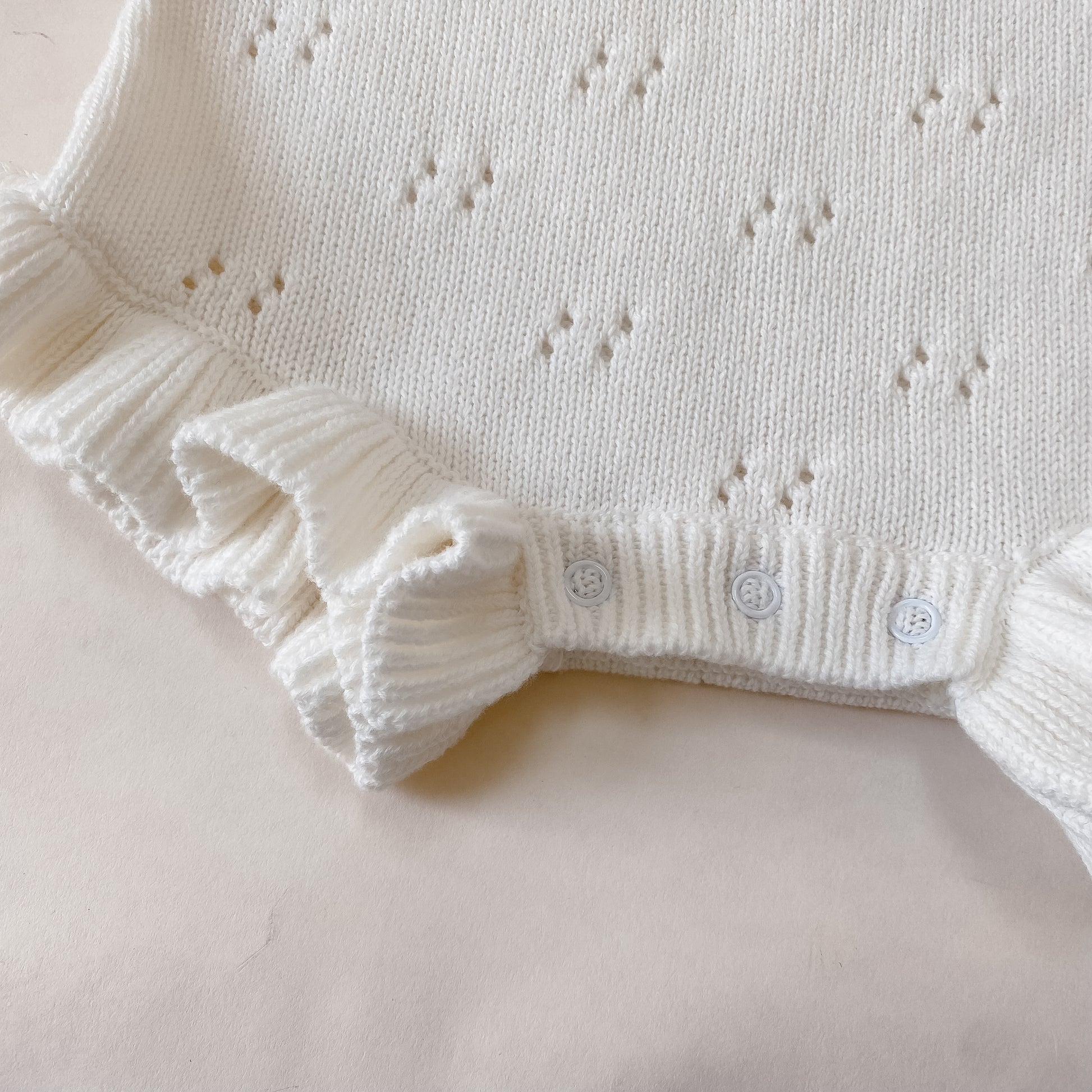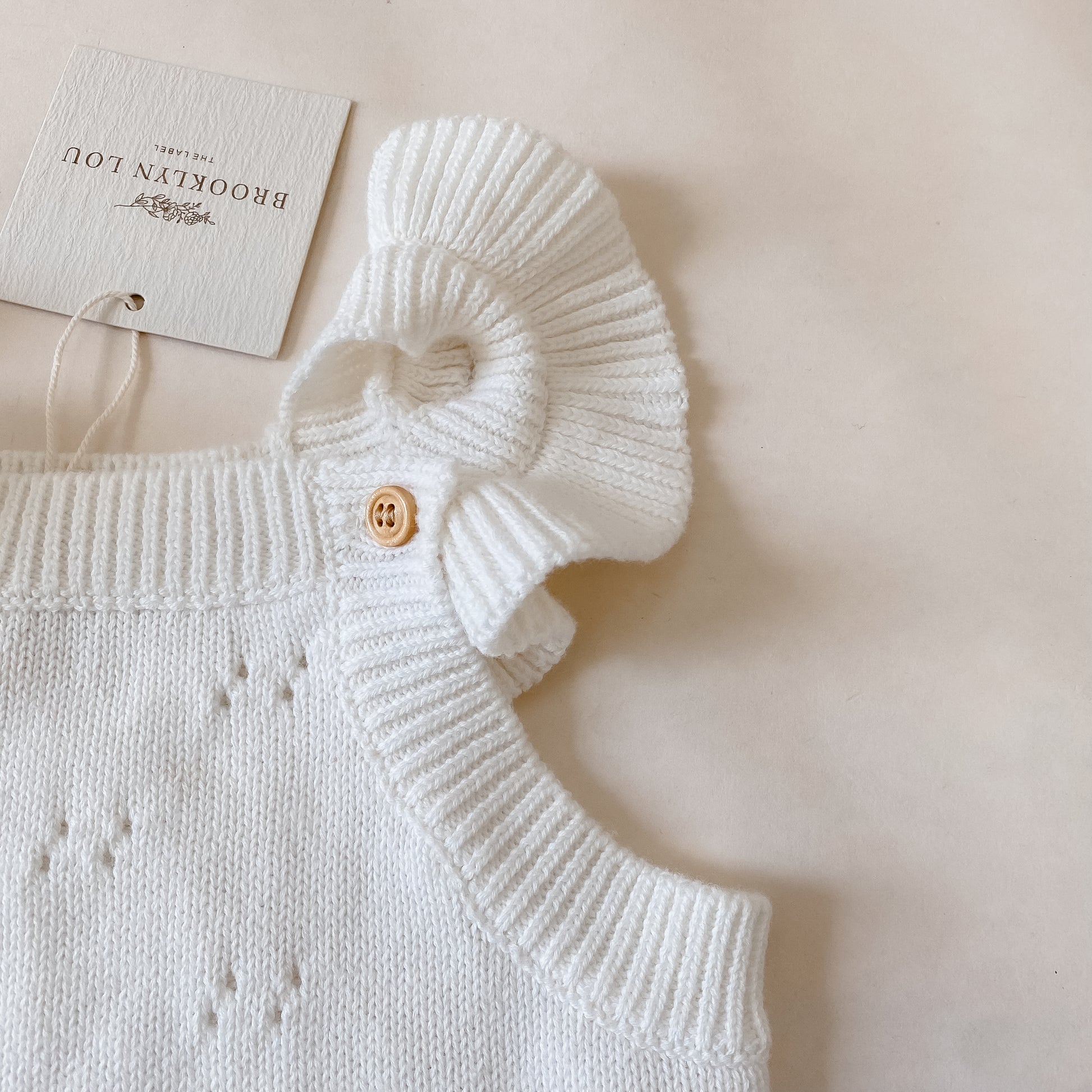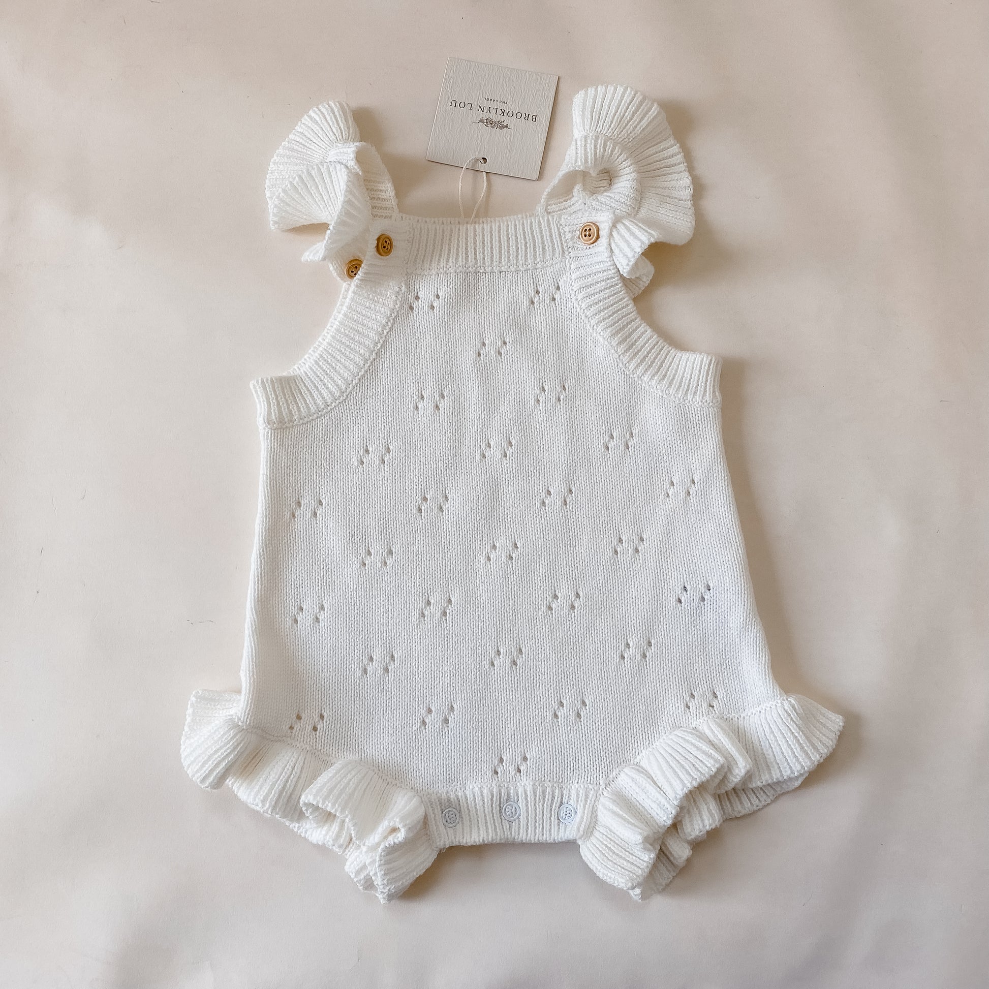 Stunning knit singlet sleeve romper with stunning flutter sleeves. Light knit fabric, perfect for warmer days or layer as it gets cooler. Shoulder straps have 2 x adjustment points for the perfect fit, plus buttons to crutch for easy nappy changes.