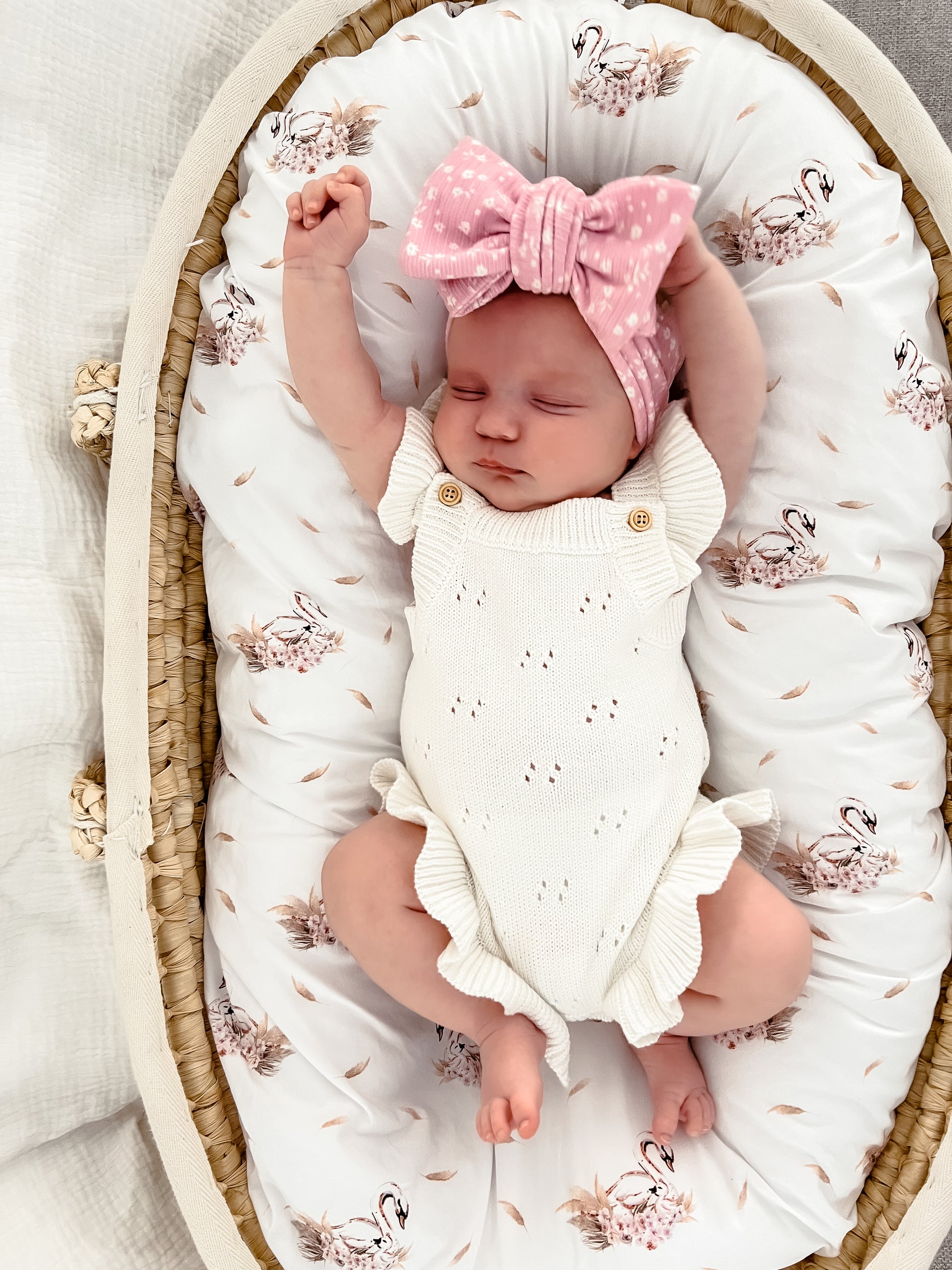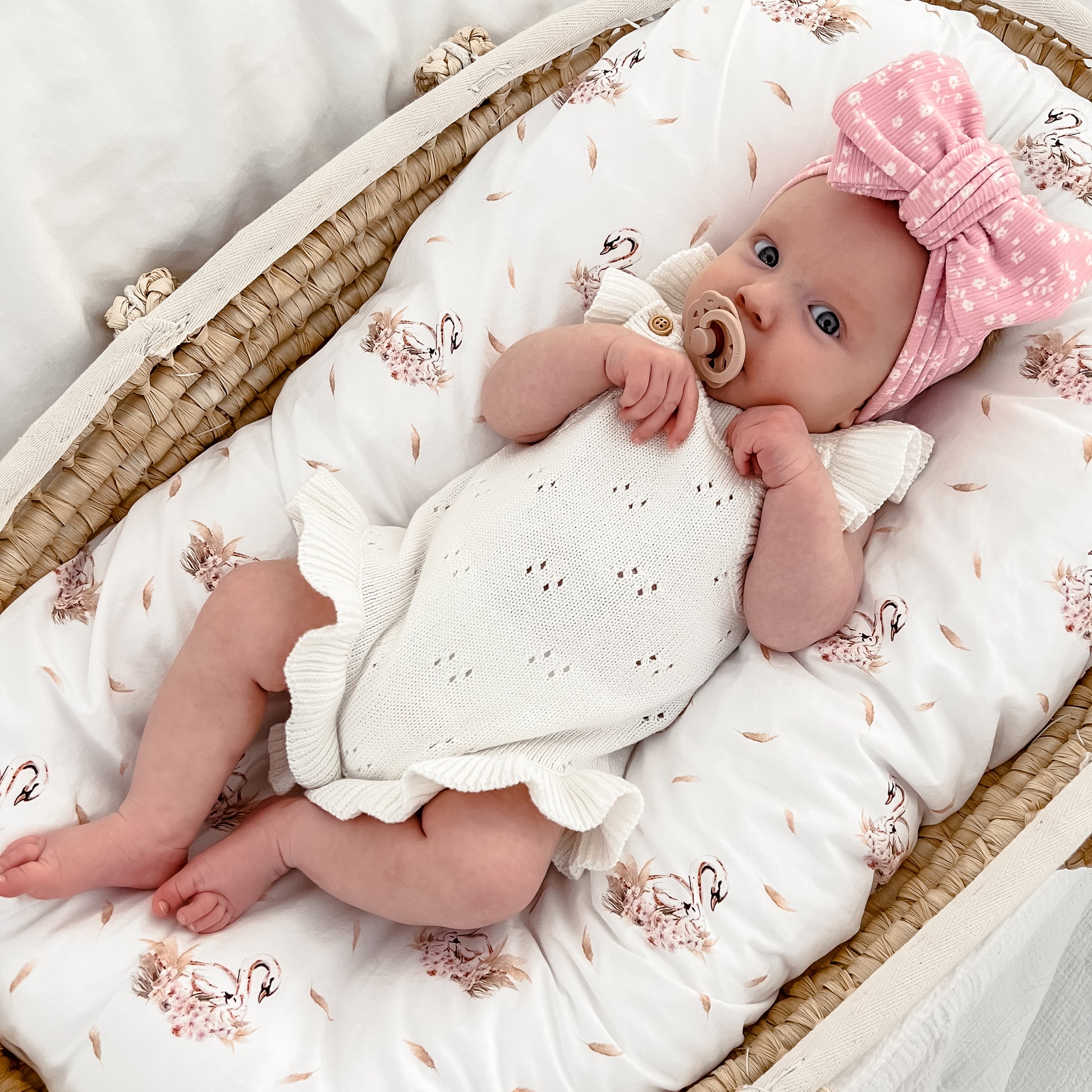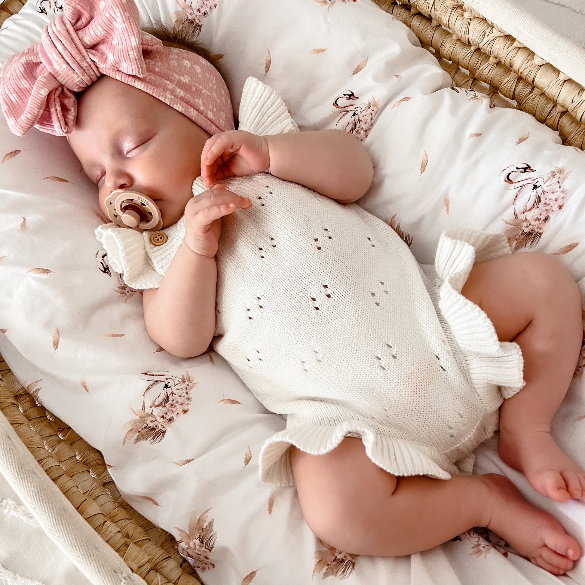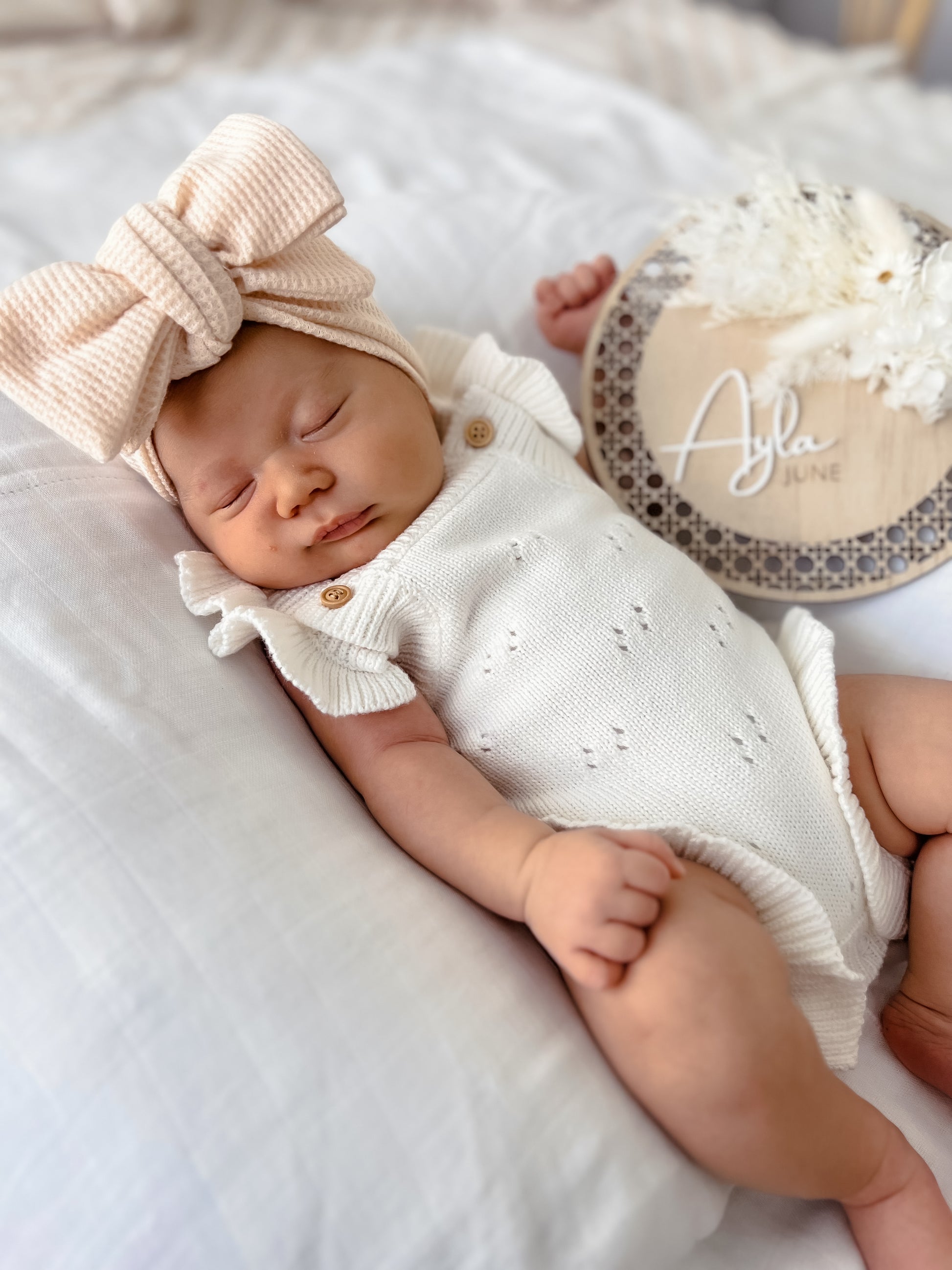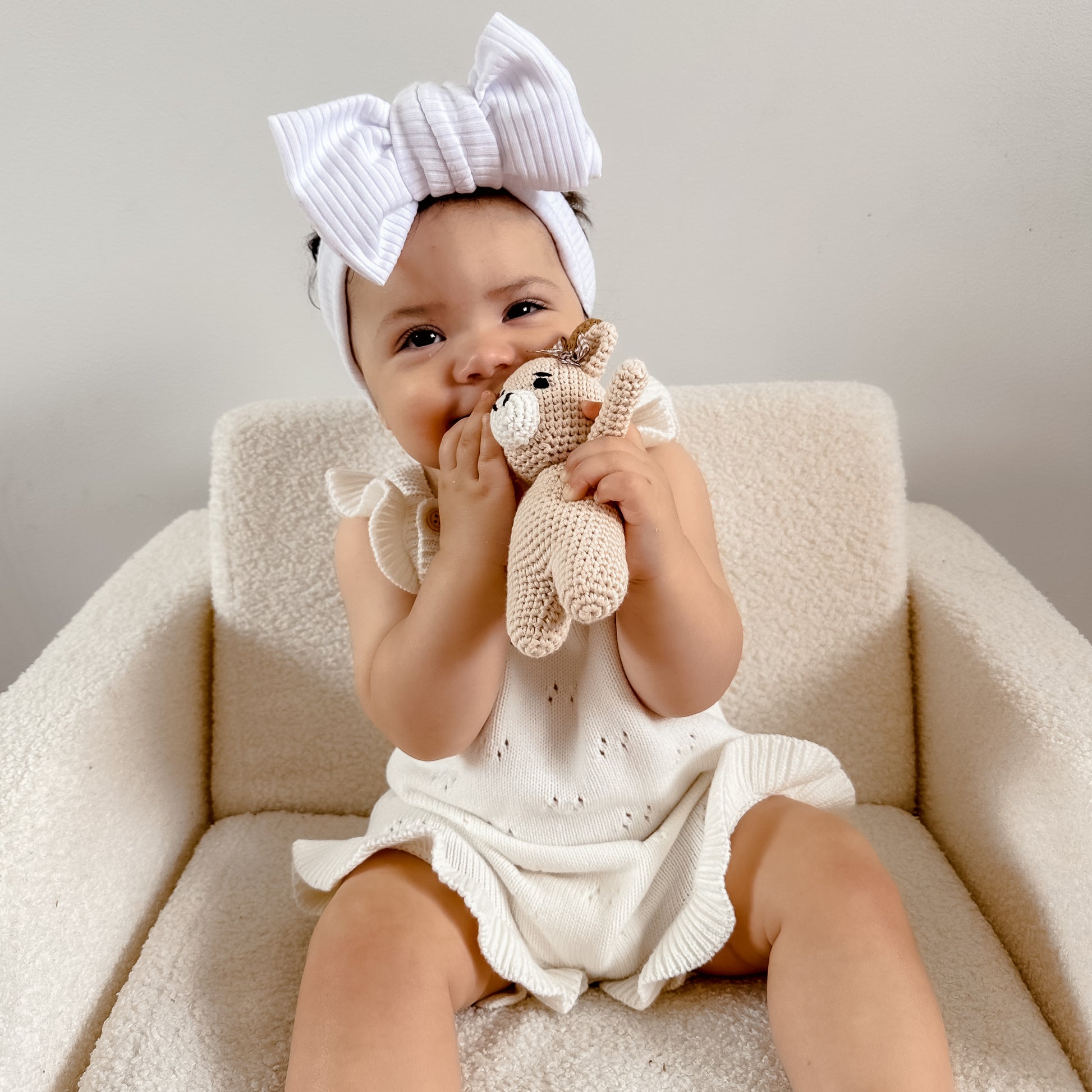 Stunning knit singlet sleeve romper with stunning flutter sleeves. Light knit fabric, perfect for warmer days or layer as it gets cooler. Shoulder straps have 2 x adjustment points for the perfect fit, plus buttons to crutch for easy nappy changes.