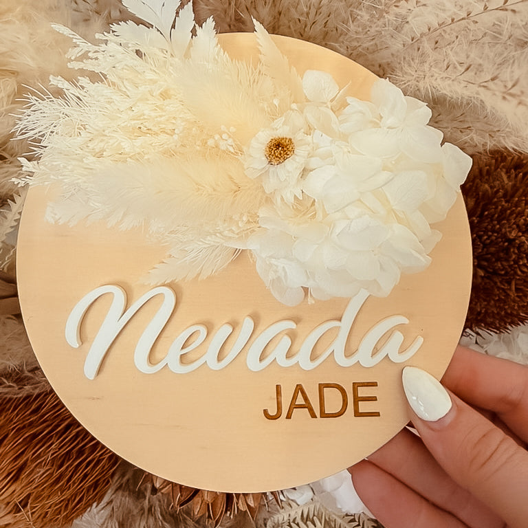 Introducing our Wooden Name Plaque with a mini dried floral arrangement, the perfect addition to your little one's birth announcement photo! This stunning name plaque doubles as a beautiful keepsake, making it a truly unique and special piece for your baby's room. (Say goodbye to boring birth announcements!)